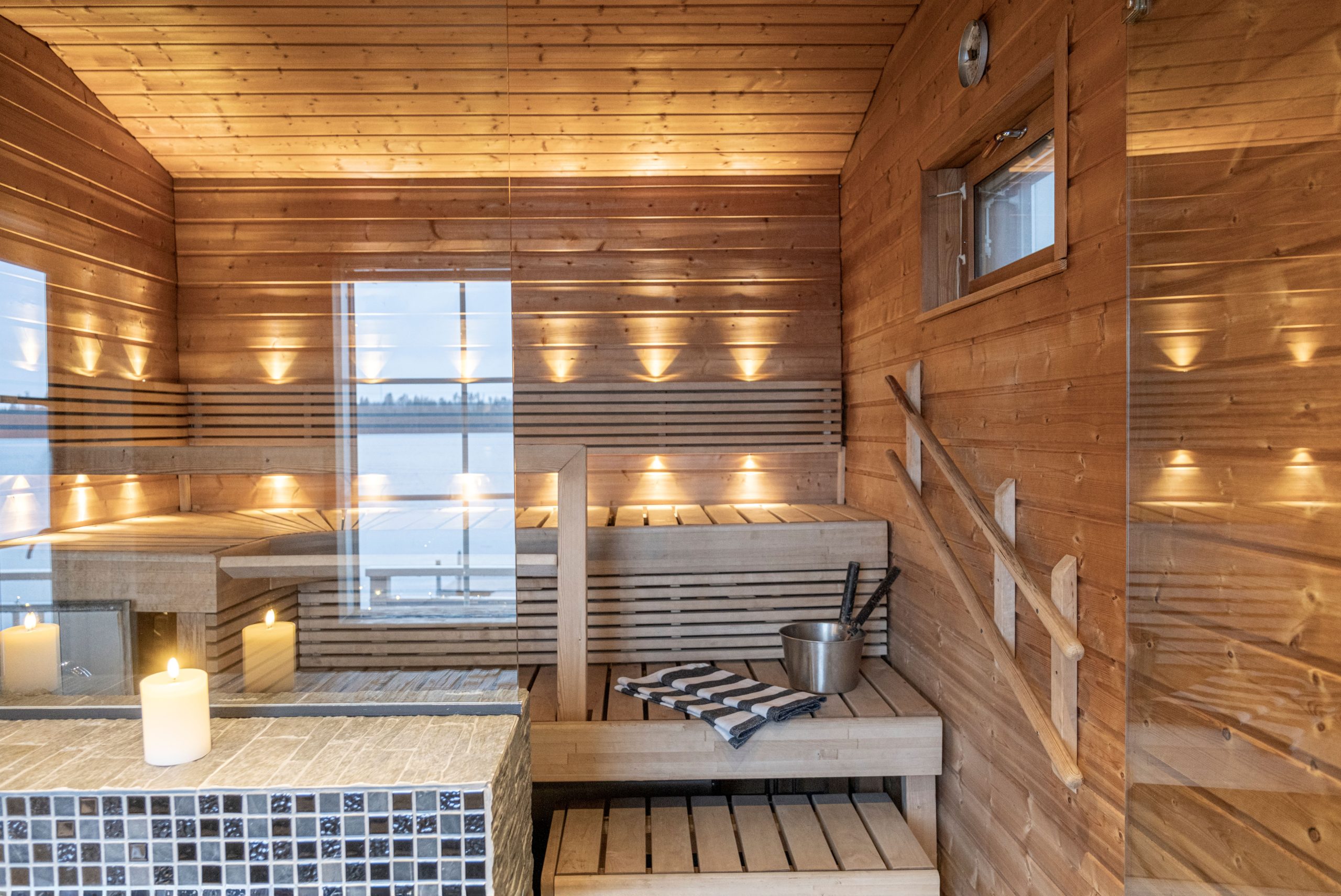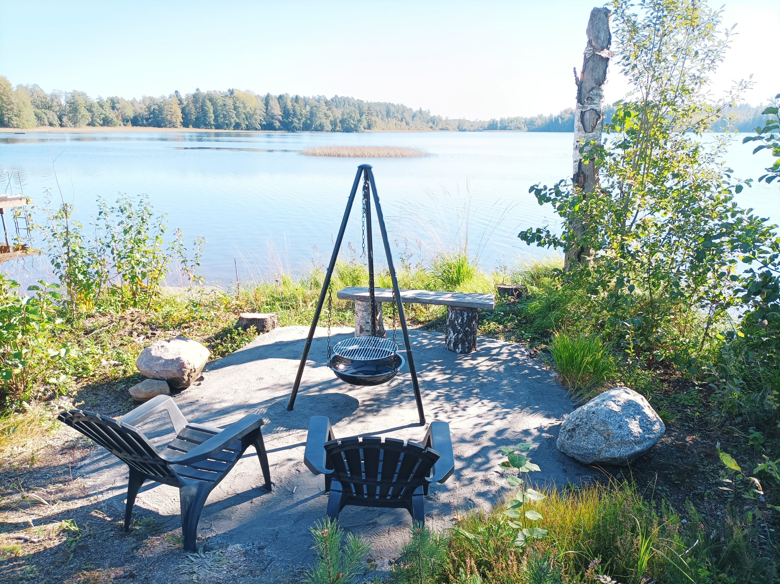 The wood-burning sauna with a shower is located 50 meters from the main facilities, close to the beach. There is a separate dressing room, where 2 additional persons can be accommodated on a sofa bed.